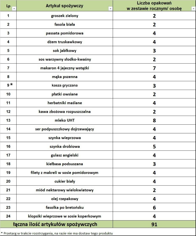 Paczka żywnościowa dla 1 osoby to minimum kilka (co najmniej trzy) artykuły spożywcze z różnych grup towarowych wydanych jednorazowo.