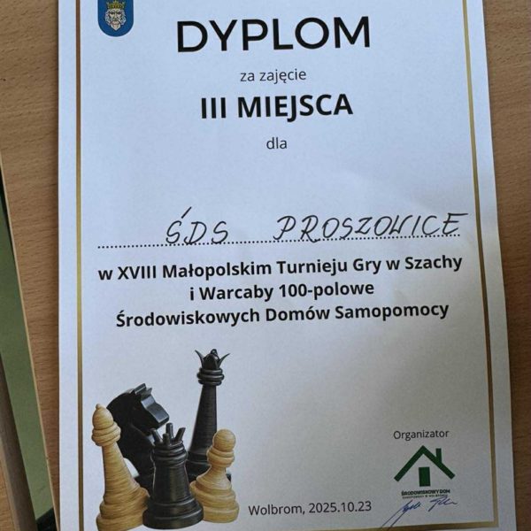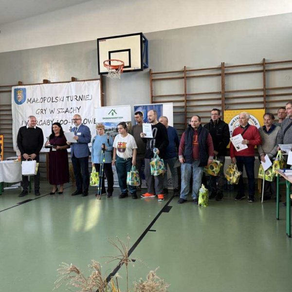 Gratulacje dla panów reprezentujących nasz ŚDS w XVIII-tym Małopolskim Turnieju Gry w Szachy i Warcaby 100-polowe, zorganizowanym przez Środowiskowy Dom Samopomocy w Wolbromiu za zajęcie III miejsca. Panowie Stanisław, Łukasz, Krzysztof i Marcin wiedzą, ze to gra wymagająca strategicznego myślenia i nie tak szybko można powiedzieć „szach i mat”.