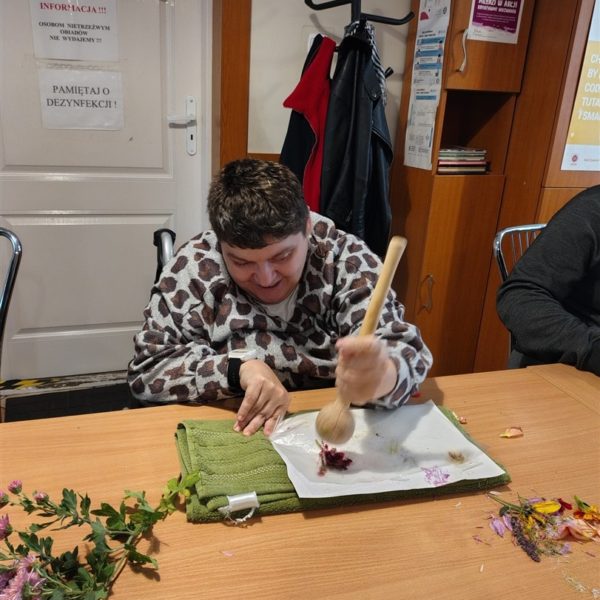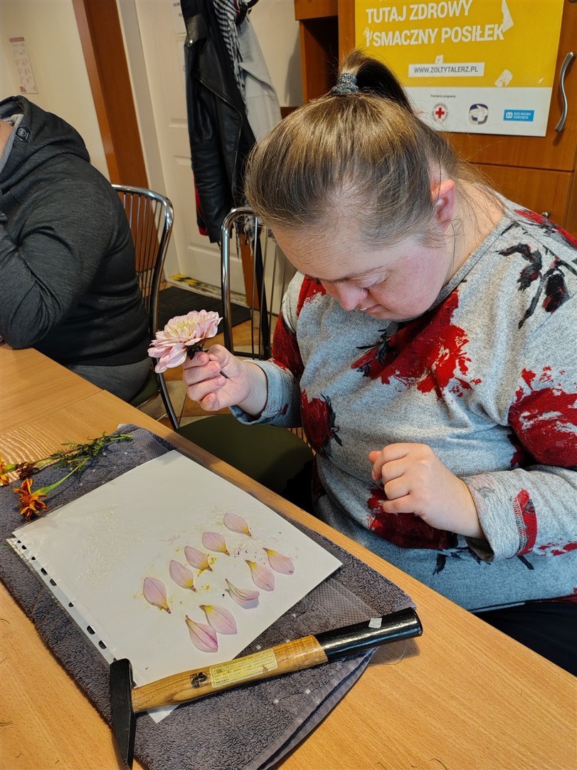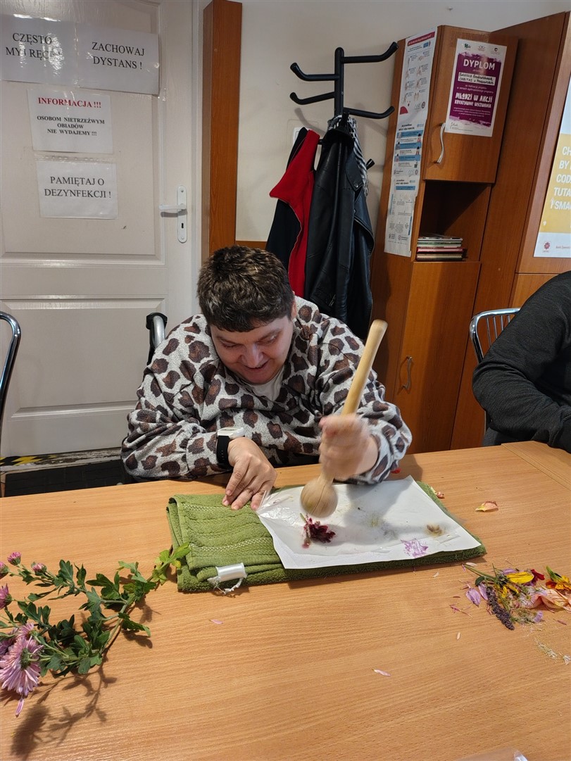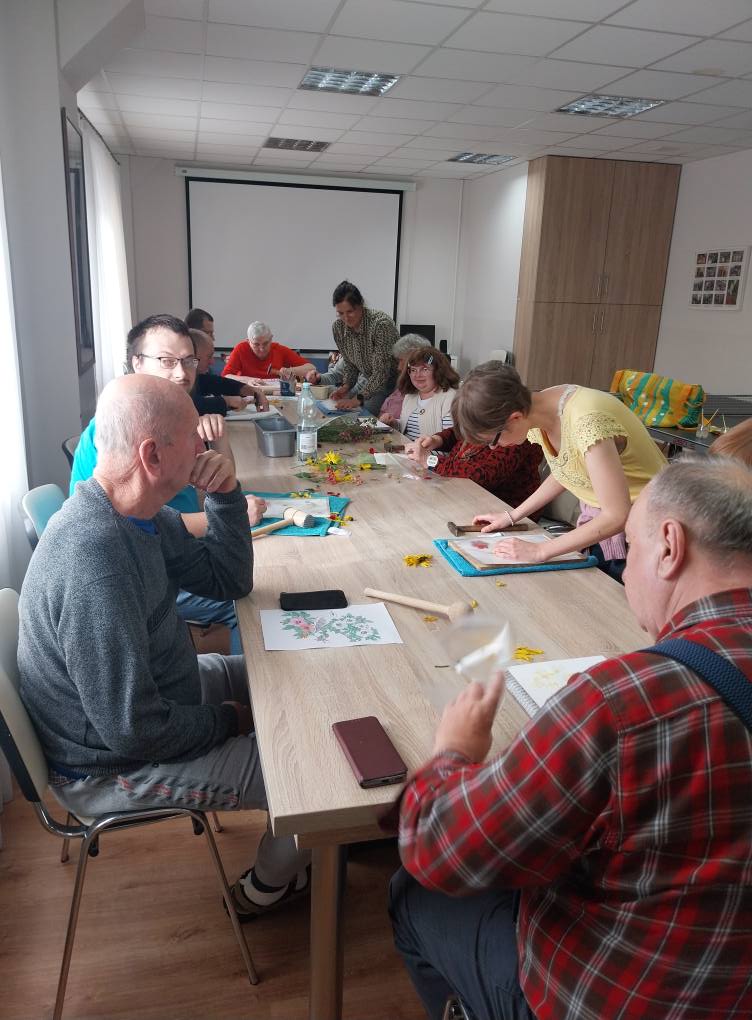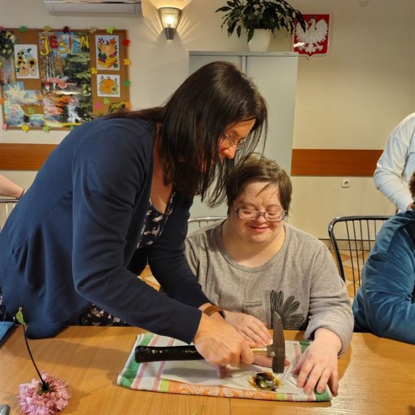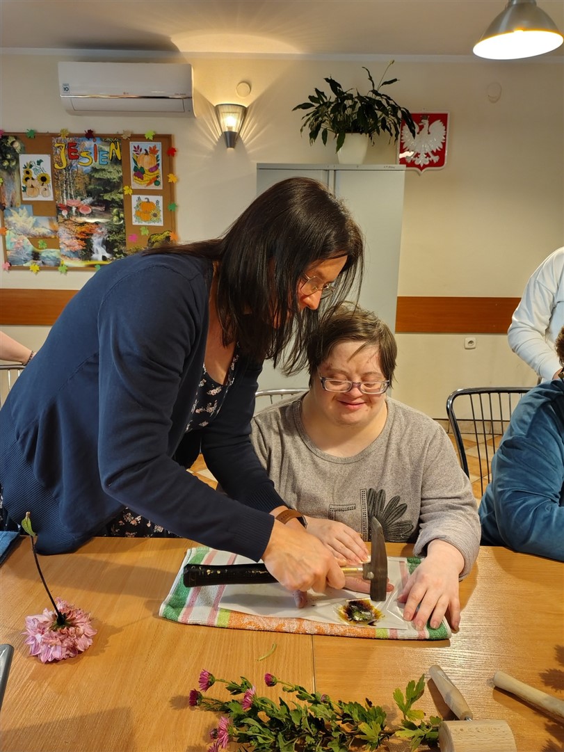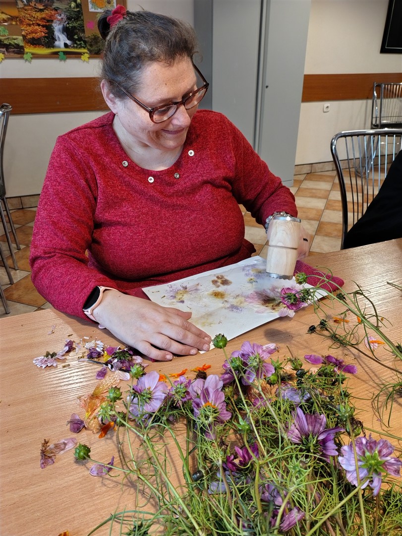W ramach projektu pn. „W naturze i z naturą” uczestnicy mieli okazję poznać technikę flower pounding, czyli ubijanie świeżych kwiatów na papierze akwarelowym. Co prawda trzeba się trochę napracować, ale potem jest radość, gdy widzi się kwiatowe obrazy.