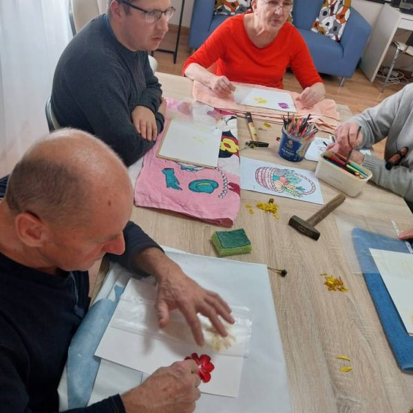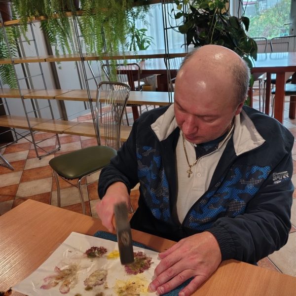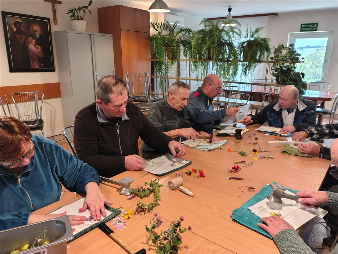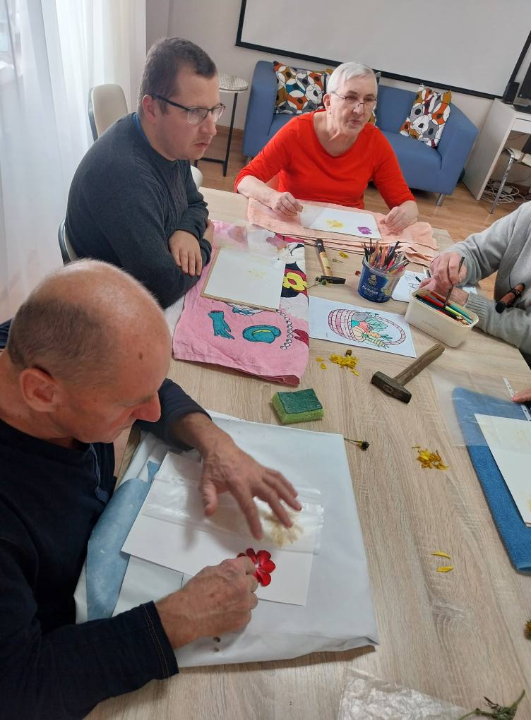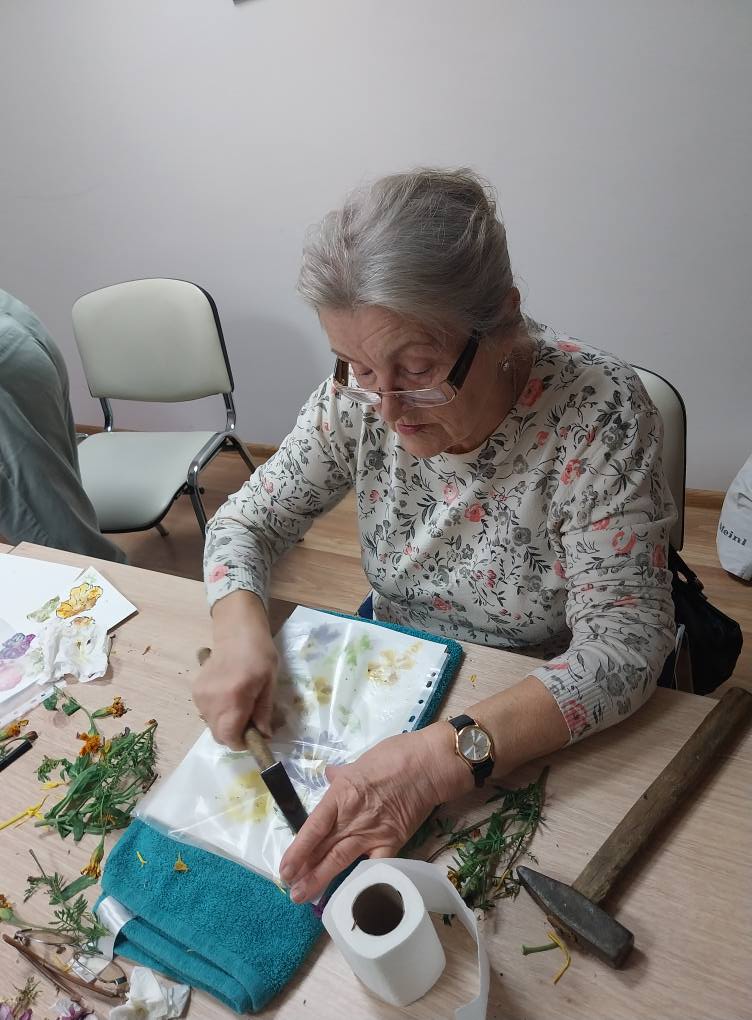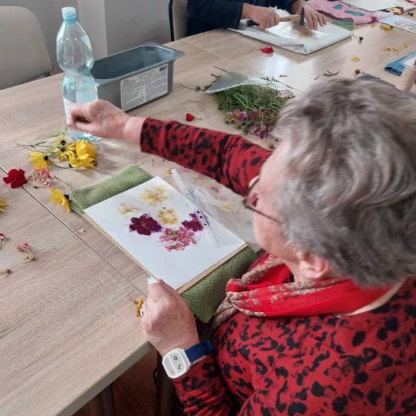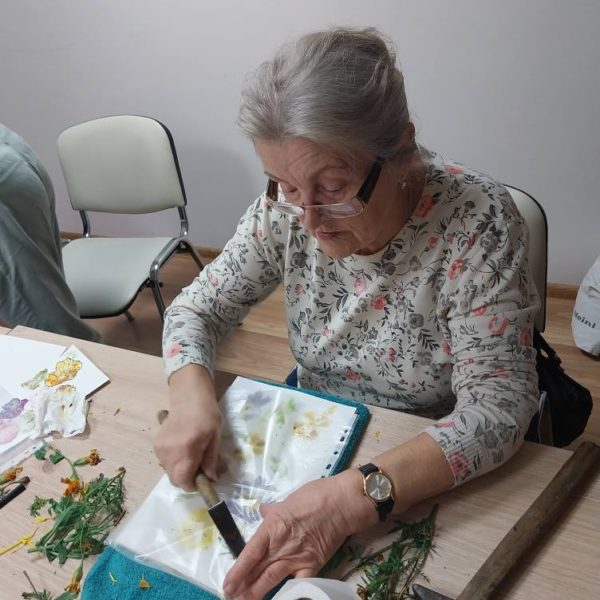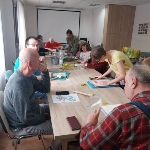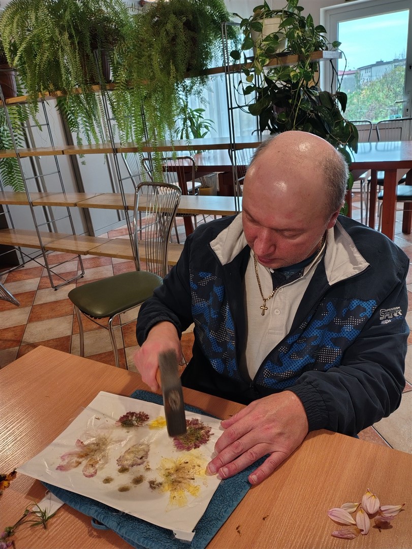 W ramach projektu pn. „W naturze i z naturą” uczestnicy mieli okazję poznać technikę flower pounding, czyli ubijanie świeżych kwiatów na papierze akwarelowym. Co prawda trzeba się trochę napracować, ale potem jest radość, gdy widzi się kwiatowe obrazy.